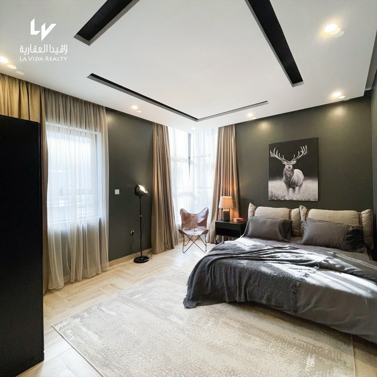 This residence features 7 rooms, including 4 bedrooms and 5 bathrooms. The design includes a spacious living room, a well-equipped kitchen, and a designated dining area. Additionally, there is a private lounge for men and another one for women for social gatherings. The property is equipped with a laundry room or maid's room, a driver's room, upper and ground water tanks, independent air conditioning, ample parking spaces, and an elevator for added convenience, as well as a central vacuum system.